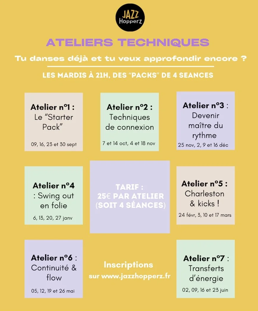 Un tarif spécial sera proposé pour les ateliers de perfectionnement thématiques (forfait de 4 cours), réservés aux danseurs ayant pratiqué au minimum trois années de Lindy Hop. Planning des thématiques ci-dessus.